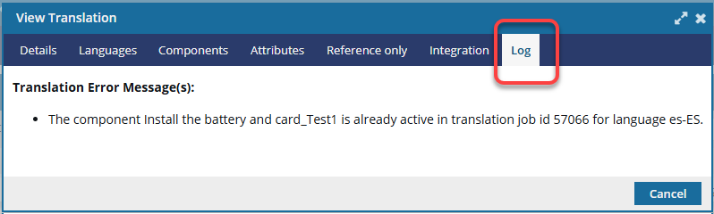 The Log tab is also available in the Update Translation screen. - On the View Translation screen, look for a Log tab.