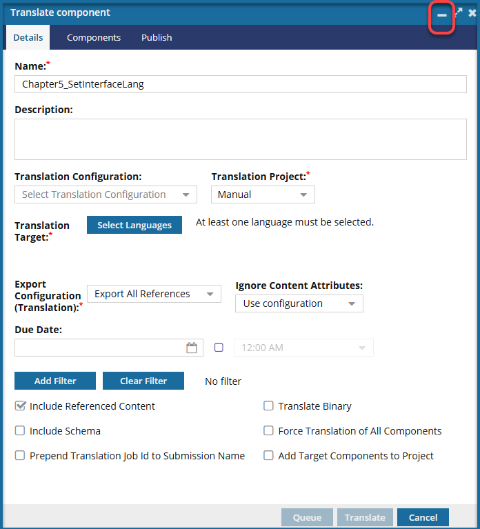 When you open the Translate component screen to fill out the details for a translation request, you can now minimize this screen to go and check other Inspire screens for information.