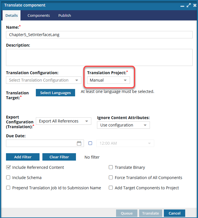 - In Translation Project, you must select a Manual option.