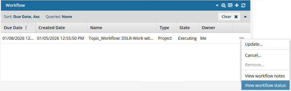 After you create a workflow, you see more tracking details by reading the notes users can leave when completing a task, and by seeing the workflow template with status highlights. The Notes and Status options are only available for Topic workflows.