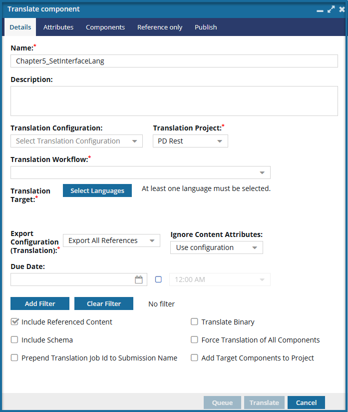 You can choose what to do with your translation job; either start to Translate or Queue the job.