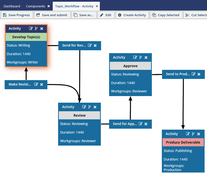 Inspire provides you with a template for the process of developing content. If you want a workflow that contains different steps, or you want to add actions or transitions between activities and manage workgroups, you can update the workflow template to tell Inspire how to automate the workflow you need.