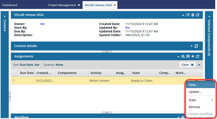 In this State, the assignment exists as a placeholder. You do not have to assign a user to complete the assignment or add any components. A project owner or user with permissions can take the following actions on an assignment in this state: