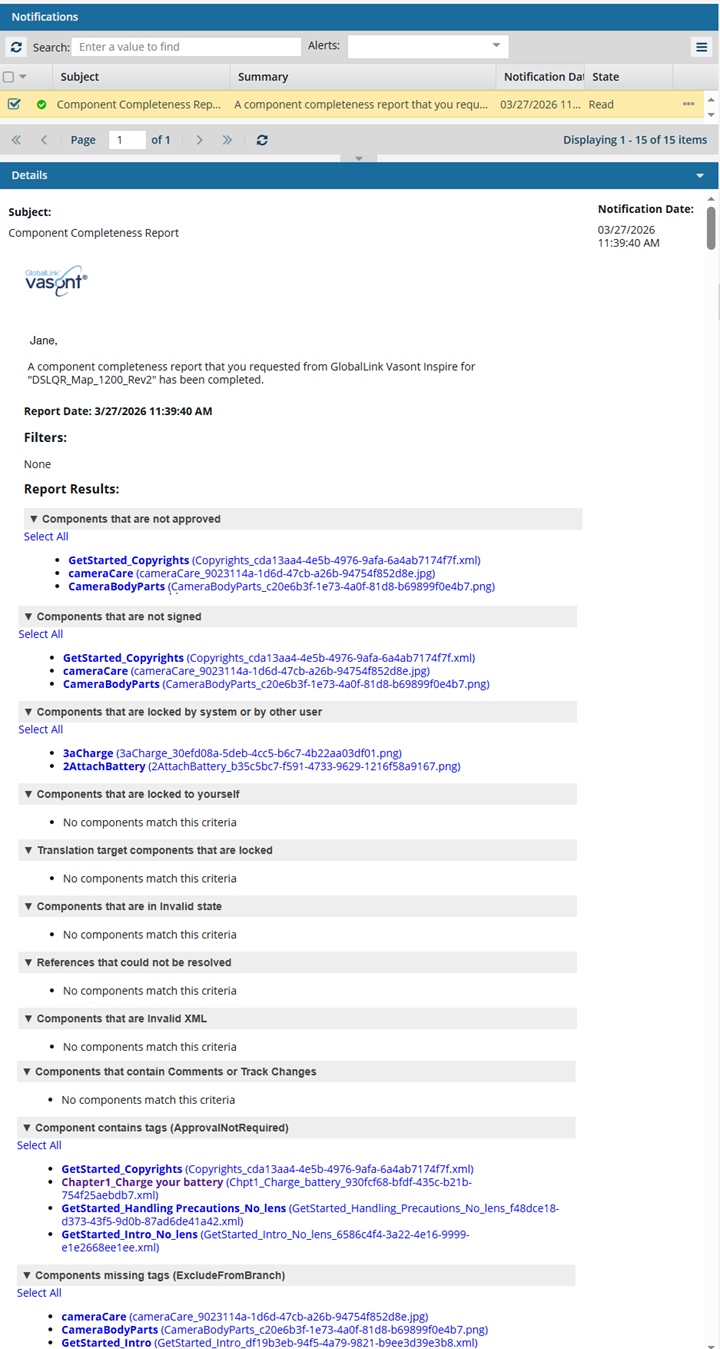 10. From the list of notifications, select the one that says Component Completeness Report.