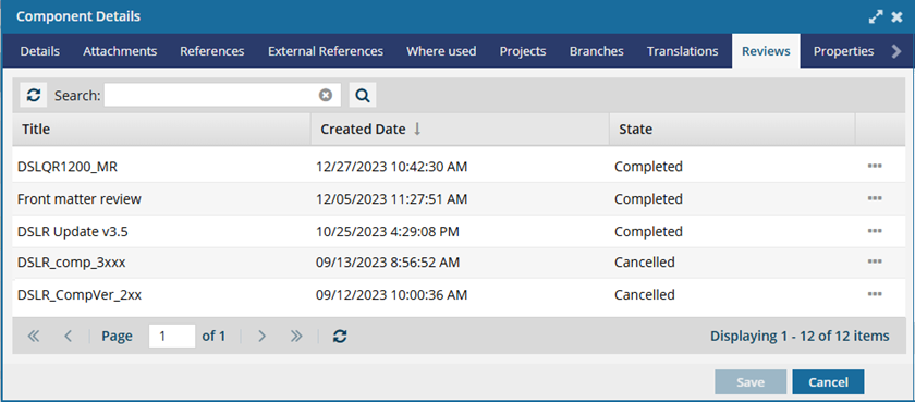 You can see if the selected component has been included in any reviews on the Component Details' Reviews tab. If the selected component was included in a review, but the review has been archived, it won't be listed here. To quickly open a listed review, use the Options menu.