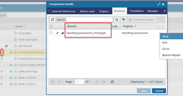 - The Branch column tells you how to find the branched copy. It's named Handling precautions_Prototype. If other references in the source component are also branched, they'll have the same suffix: _Prototype.