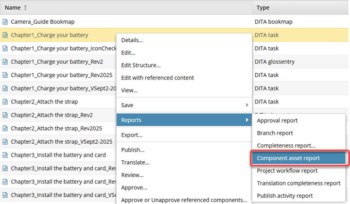 You can select a component and create a report to see all of the component's references, including links to other topics, content references to elements in other topics, file and web links, and inserted images. If the component is a map, you can also see references to other maps.