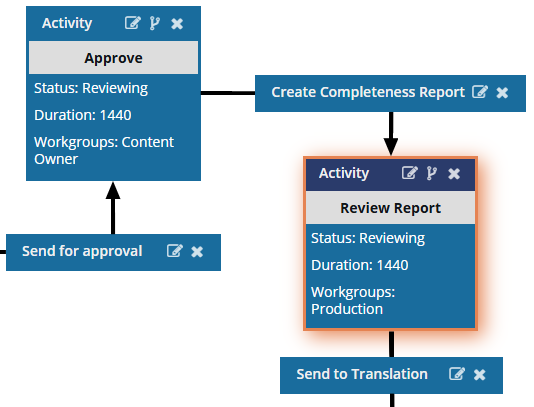 In an Inspire workflow template, you can design the process you use to develop content and provide deliverables to your customers. This process can include running a completeness report before you publish a component or send it for translation, so that you can see if there are any errors or problems. In a workflow template, after you have Inspire create the report, you need to add an activity for a Workgroup user to review the report before the workflow advances.