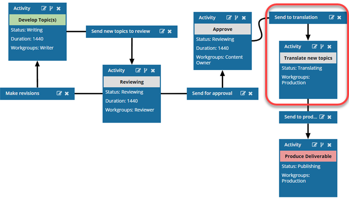 In an Inspire workflow template, you can design the process you use to develop content and provide deliverables to your customers. This process can include translating your content. In a workflow template, you can include an action that tells Inspire to open the Translate component screen with any known details and associated components. This allows a translation coordinator to quickly send workflow content to translation and advance the workflow to the translation stage.