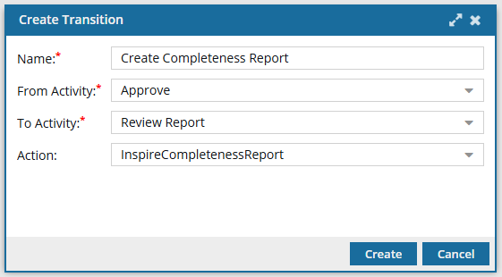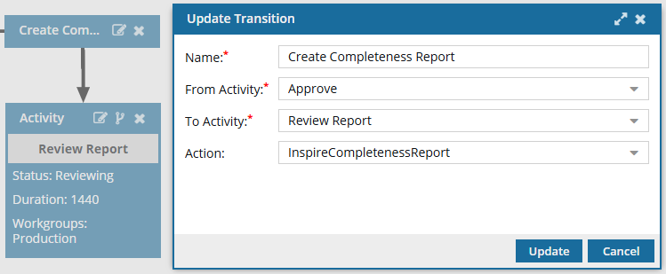 - You use transitions to tell Inspire what to do when an Activity in a workflow is completed. For example, after the topics are approved, you can create a transition to tell Inspire to create a Completeness Report.