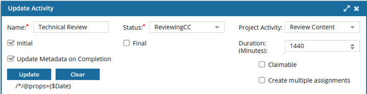 If you want Inspire to populate or clear an XML element or attribute value across components participating in the workflow, select the Update Metadata on Completion option.