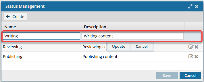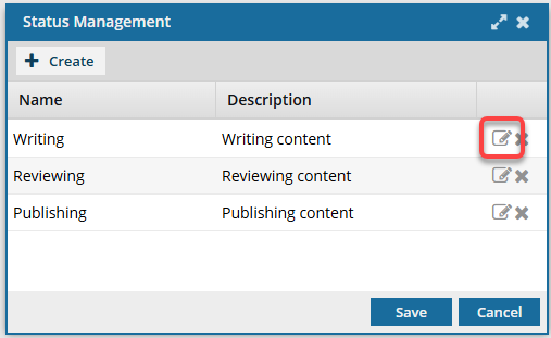 If you don't want to create a new status, you can edit the ones that Inspire provides. A Status identifies what's happening to the components during an Activity in the workflow. After you edit a Status, Inspire applies those changes to all Activities where it is currently in use.