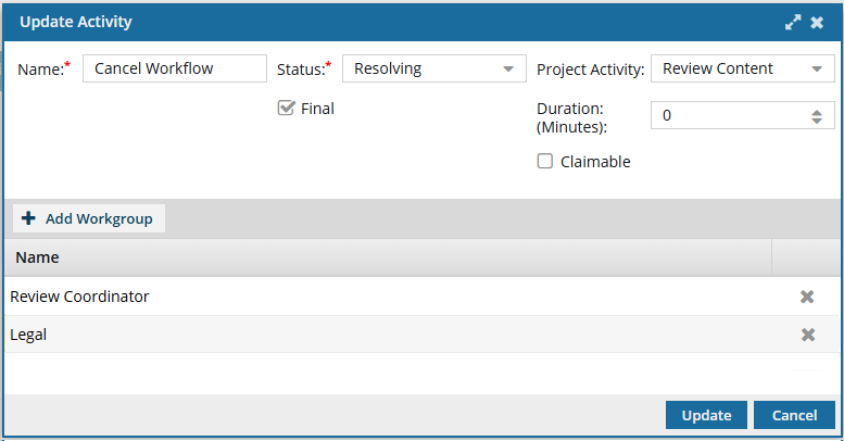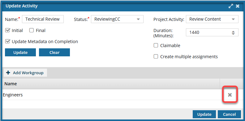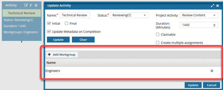 Each activity in the workflow template has an associated workgroup that identifies who completes the work. You can change workgroup assignments by editing the specific activity. If you want to update the workgroup itself, follow the steps in Edit template workgroups.
