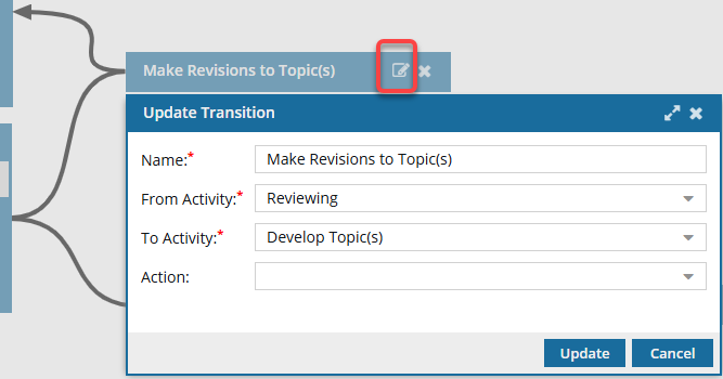 You use transitions to identify what should happen when a workflow Activity is completed. You can change the start and ending activities to move a transition within the workflow steps. You can also edit the transition Name and manage any attached Actions.
