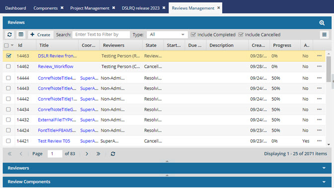 After you open a project, you can go to the workflow pane, and for any review workflow use the Options menu to open the Reviews Management tab and see the review highlighted.