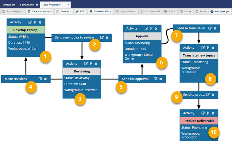 - When users in the Workgroups: Content Owner or the coordinator complete their task, Inspire moves the workflow to the linked Activity: Translate new topics.