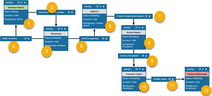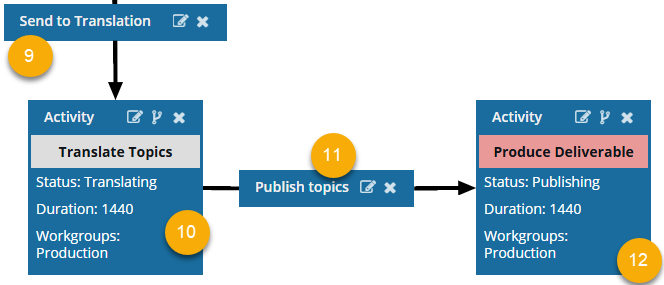 - When users in the Workgroups: Content Owner or the coordinator complete their task, Inspire moves the workflow to the linked Activity: Translate new topics.