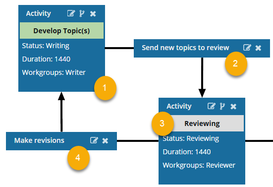 - If the users in the Workgroups: Reviewer or the coordinator select the next step to be Make revisions, Inspire moves the workflow back to the initial Activity: Develop Topic(s). The workflow starts again at step