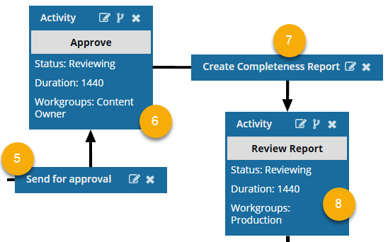 - The users in the Workgroups: Content Owner or the coordinator completes the Approval activity and advances the workflow to the Transition Create a Completeness Report.