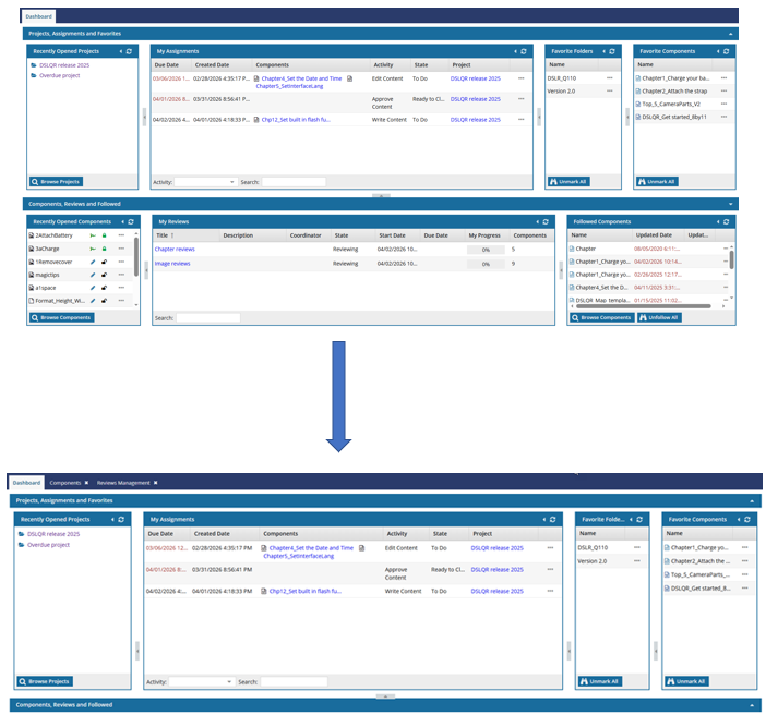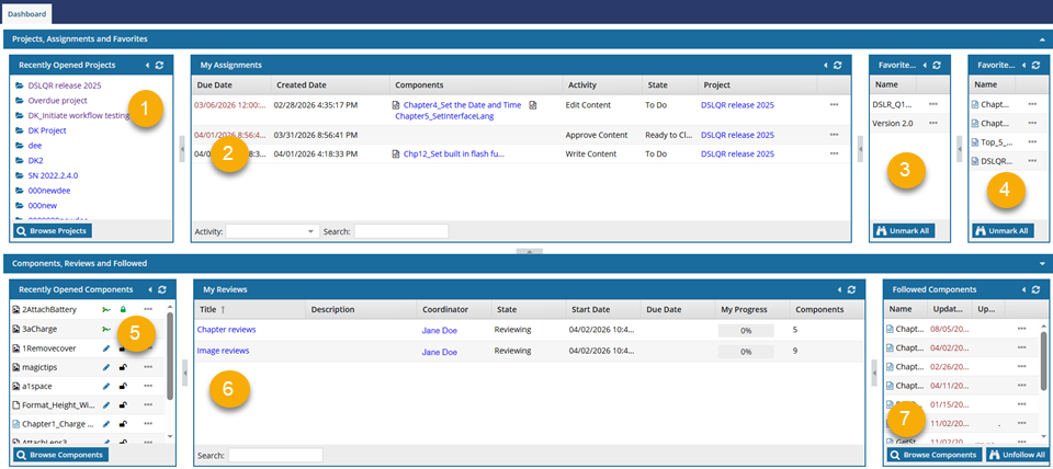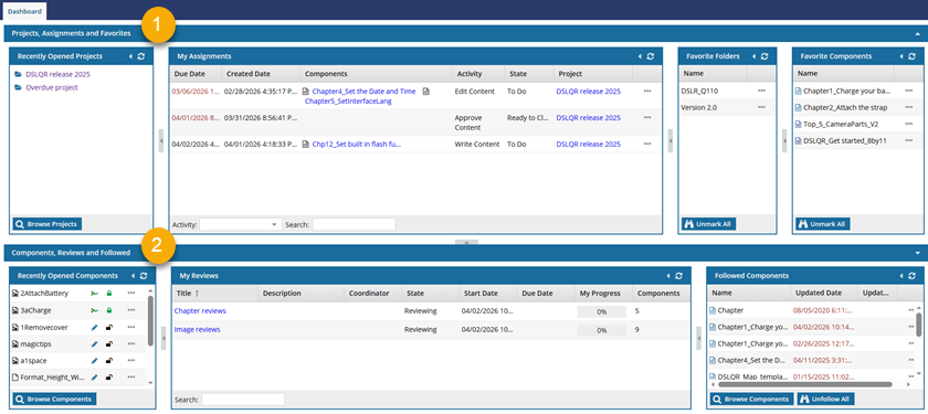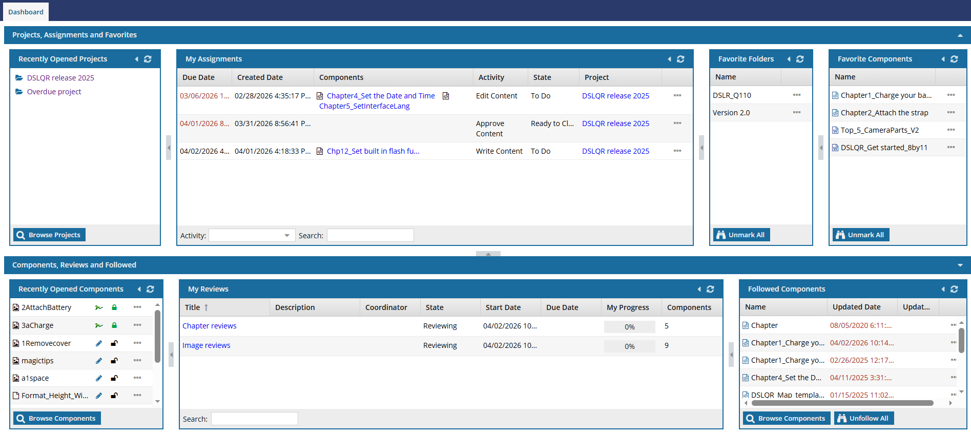 The Dashboard module gives you quick access to projects and components that you've recently opened. You can also see a high-level view of your assignments and reviews.