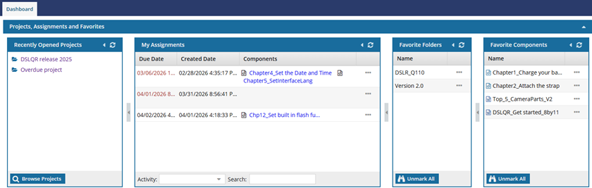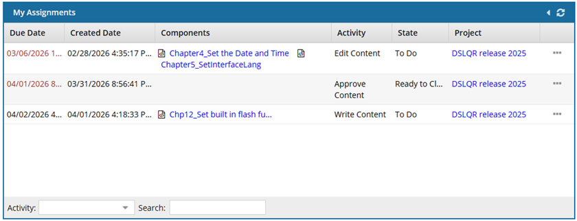 My Assignments gives you quick access to the components in projects where work has been assigned to you. It also provides actions for you to take.