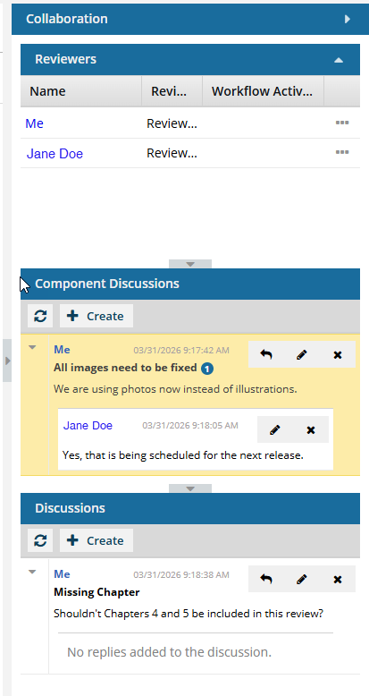 - Only the review coordinator or administrator can edit or delete messages in the Component Discussions and Discussions (for the entire review) panes.