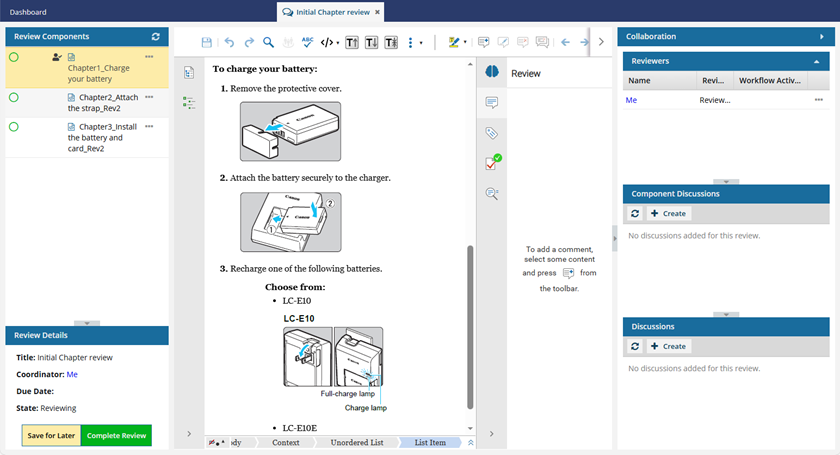 When you finish reviewing a component, come back to this pane to let the coordinator know you're done with your review. You use the Complete Review button to submit your comments and changes. This completes your review, and you can't edit that component again.