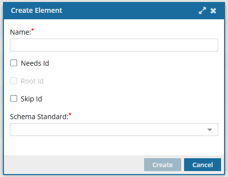 As an Inspire administrator, you can add elements to configure component relationships. When creating elements, you can set properties to specify if an element needs an ID, is a root or document element, and the schema standard that must be used when validating the element.