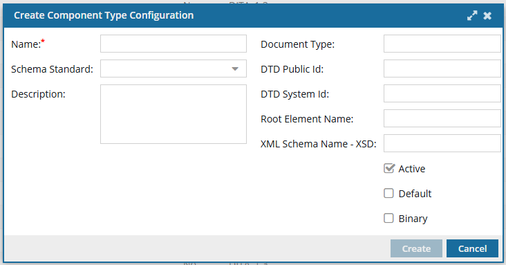 - On the Create Component Type Configuration screen, in the Name box, enter a unique name that content authors will see in 50 characters or less. For example, you could enter "DocBook article".