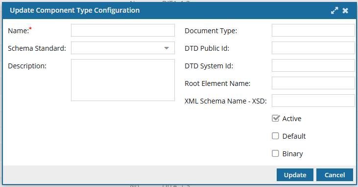 - On the Update Component Type Configuration screen, in Name, enter a unique title that content authors will see in 50 characters or less. For example, you could enter "DocBook article".