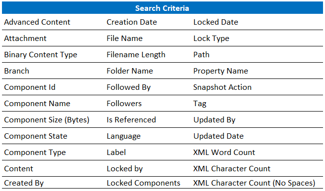If you need to use multiple criteria to find components, you can build queries. Queries can search one or more folders, and use fields, operators, and values to target specific components by ID, tag, component name, component type, and more.