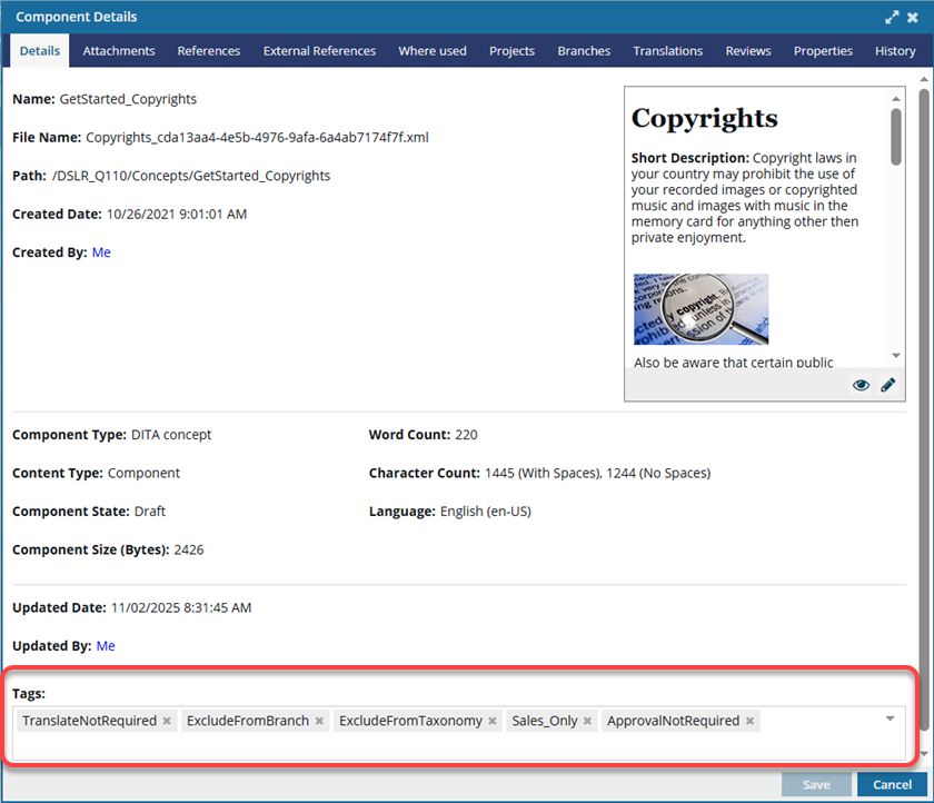 You can identify or categorize components with component tags. Keep in mind that component tags are different from tags you use when authoring content in the Oxygen editor. From the Component Details dialog you can view component tags that are assigned and add or remove tags.